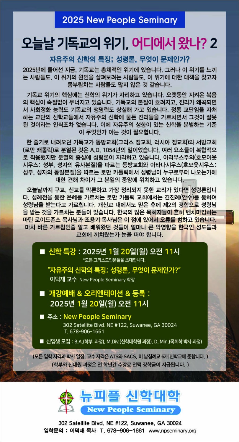 2025년 봄 학기, 개강예배와 특강, 오리엔테이션과 등록안내 페이지 정보 작성자 뉴피플신학대학 댓글 0건 조회 1,833회 작성일 25-01-08 10:45 List 본문 2025년 봄 학기 특강과 개강얘배, 오리엔테이션과 등록이 2025년 1월 20일 오전 11시에 있습니다. 주위에 있는 분들에게 알려서 함께 특강에 참여하시고, 새로운 신입생 모집에 힘써 주시면 감사하겠습니다. 다음글여름학기 시작 24.05.04