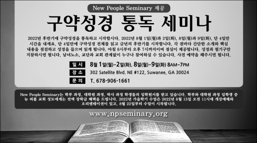 2022년 가을 학기를 위한 구약 통독에 초대합니다 페이지 정보 작성자 뉴피플신학대학 댓글 0건 조회 2,234회 작성일 22-07-12 09:59 List 본문 8월 1일과 2일, 8일과 9일 (월. 화)에 구약 성경 전체를 읽게 됩니다. 아침 8시부터 저녁 7시까이며 점심이 제공됩니다. 예약 부탁드립니다. T. 678-906-1661 이전글2023년 Spring 학기 모집 광고 및 학사 일정 22.12.29 다음글2022년 봄학기 진행 광고 22.02.21
